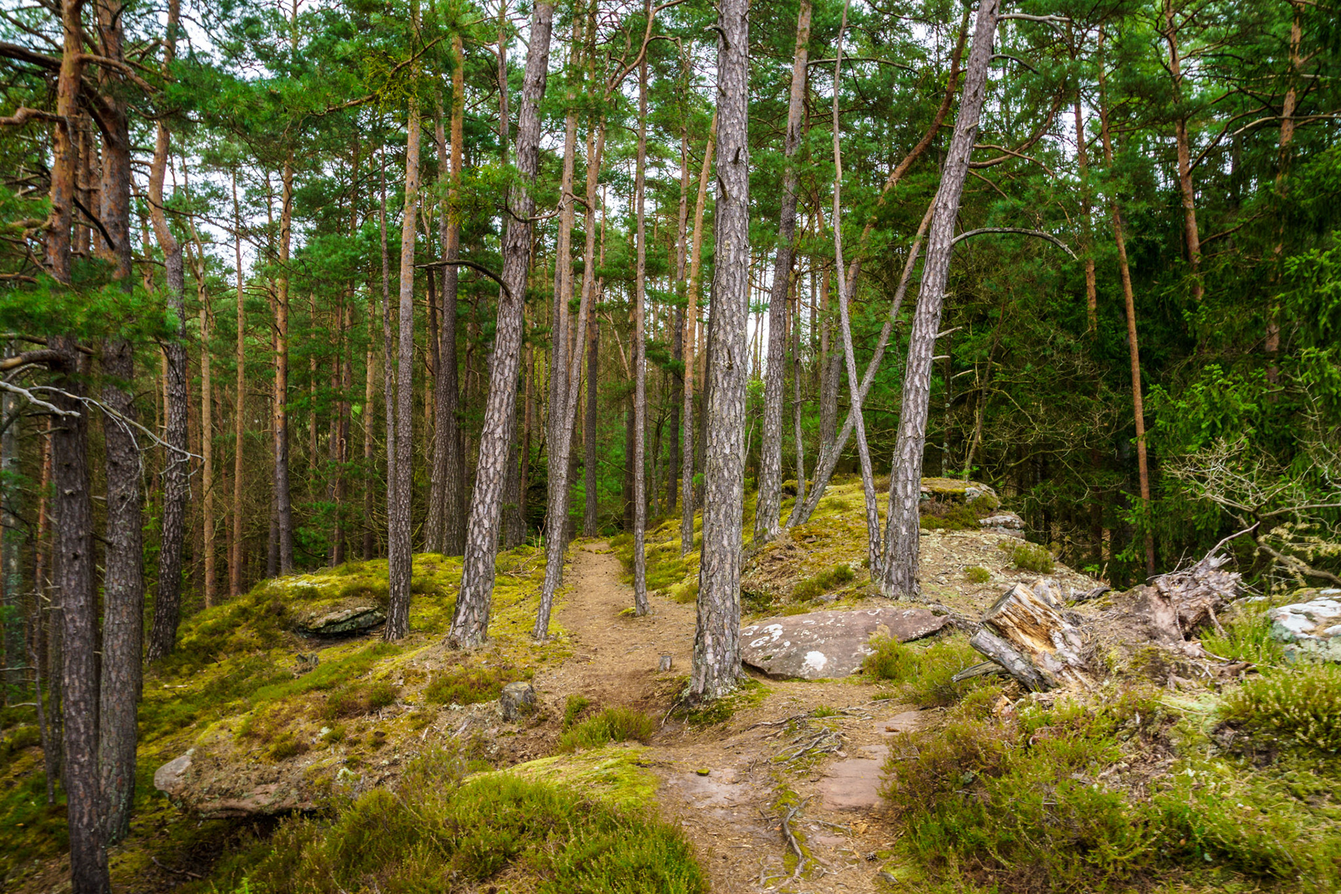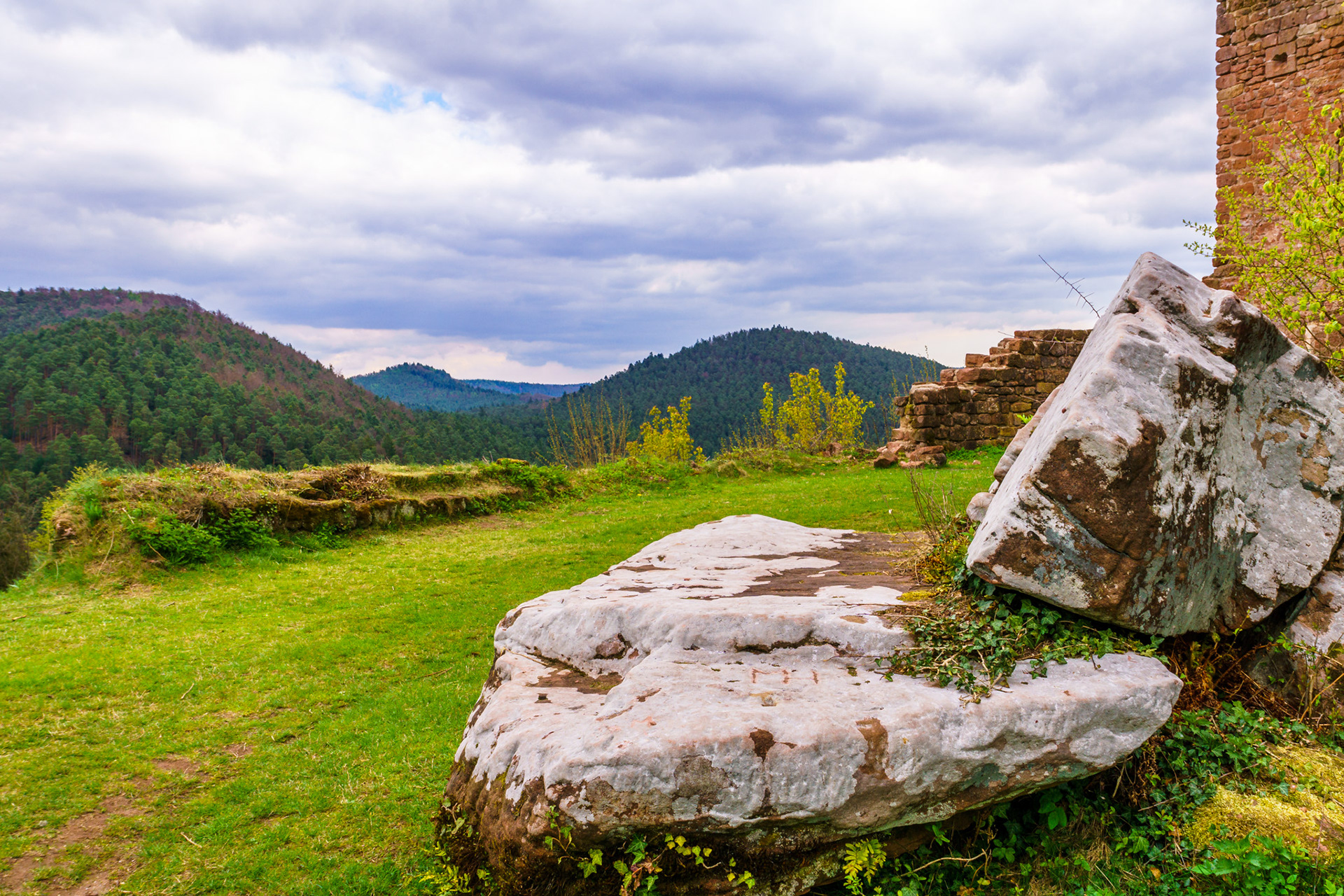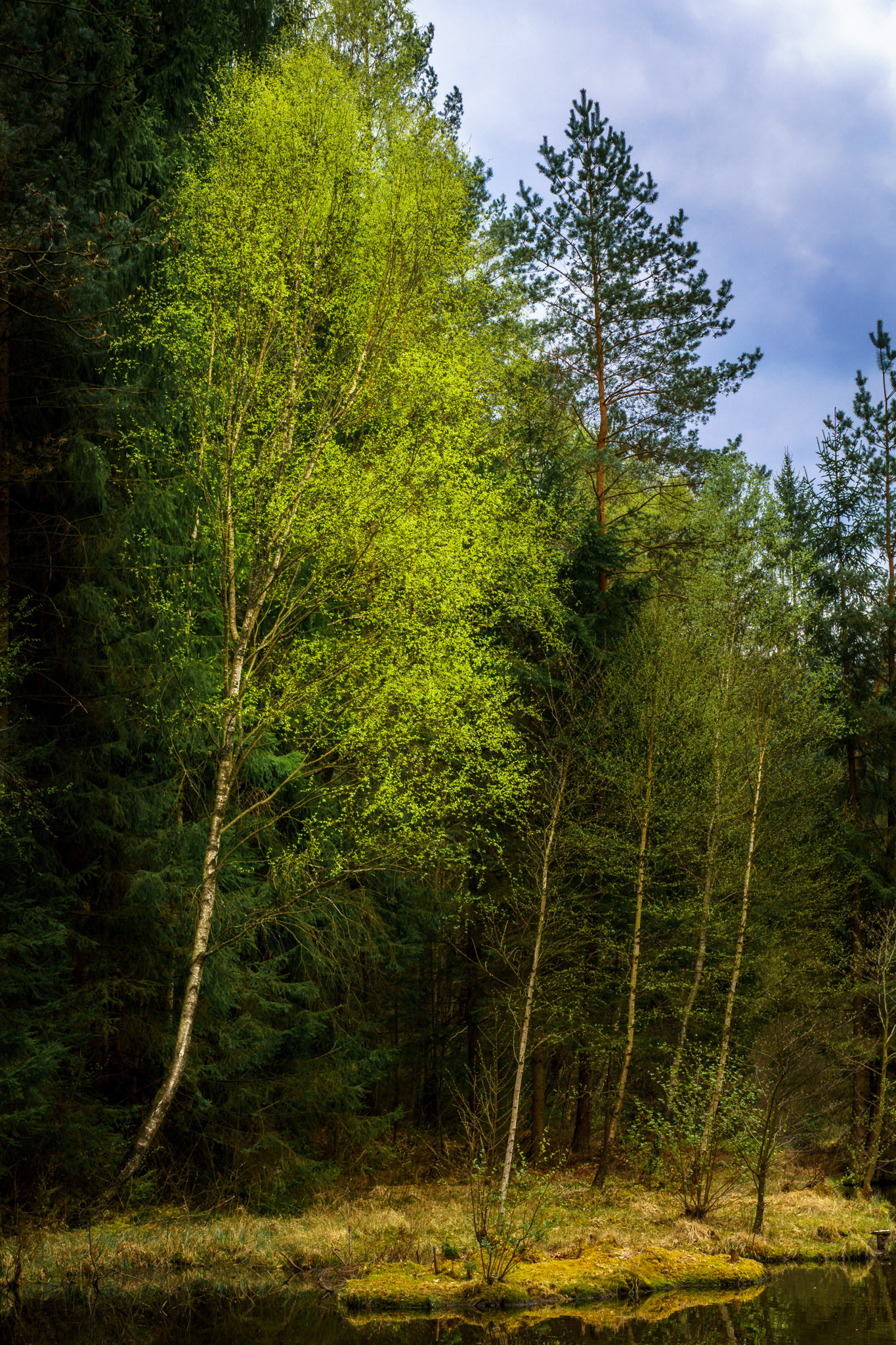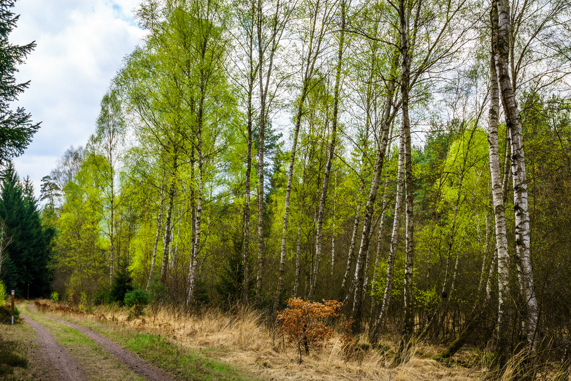 Frühlingswanderung von der Burgruine Neudahn durchs Moosbachtal zu den Hohlen Felsen. Ausblick von der Neudahn | Pfad zur Waidmannsruhe | Birken im Moosbachtal (2) | Seerosenweiher