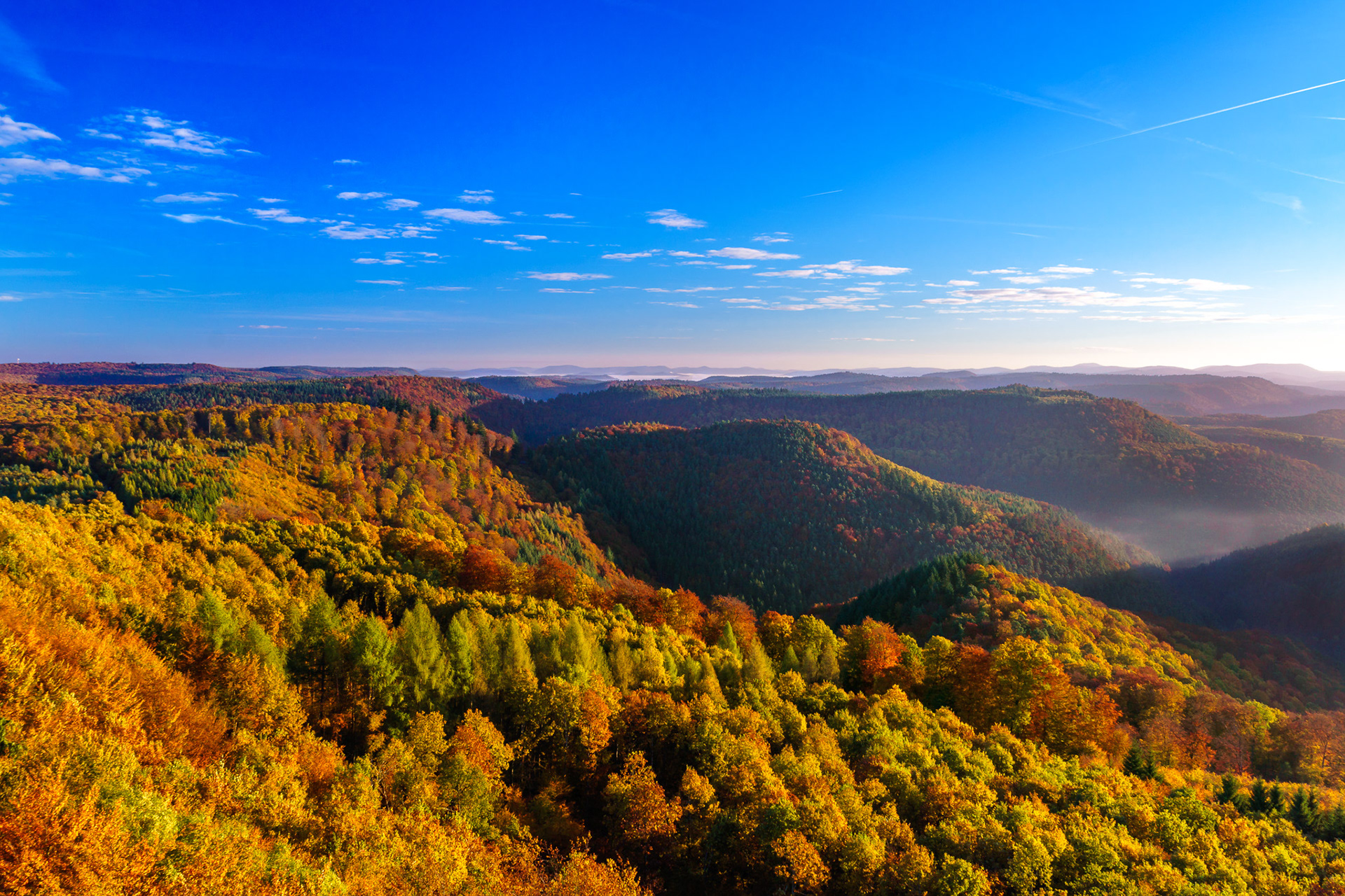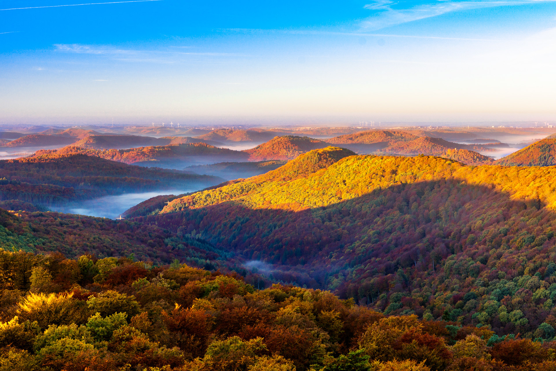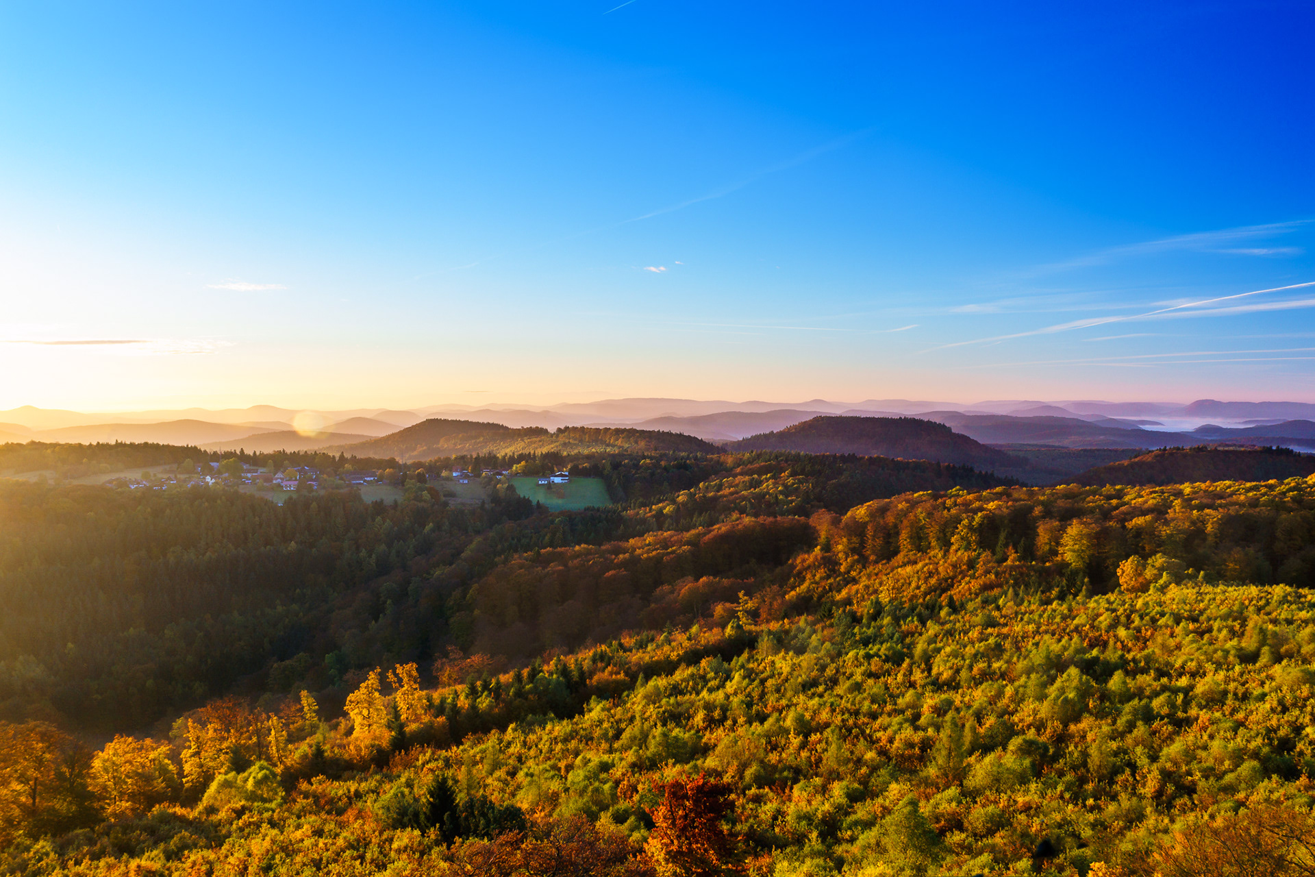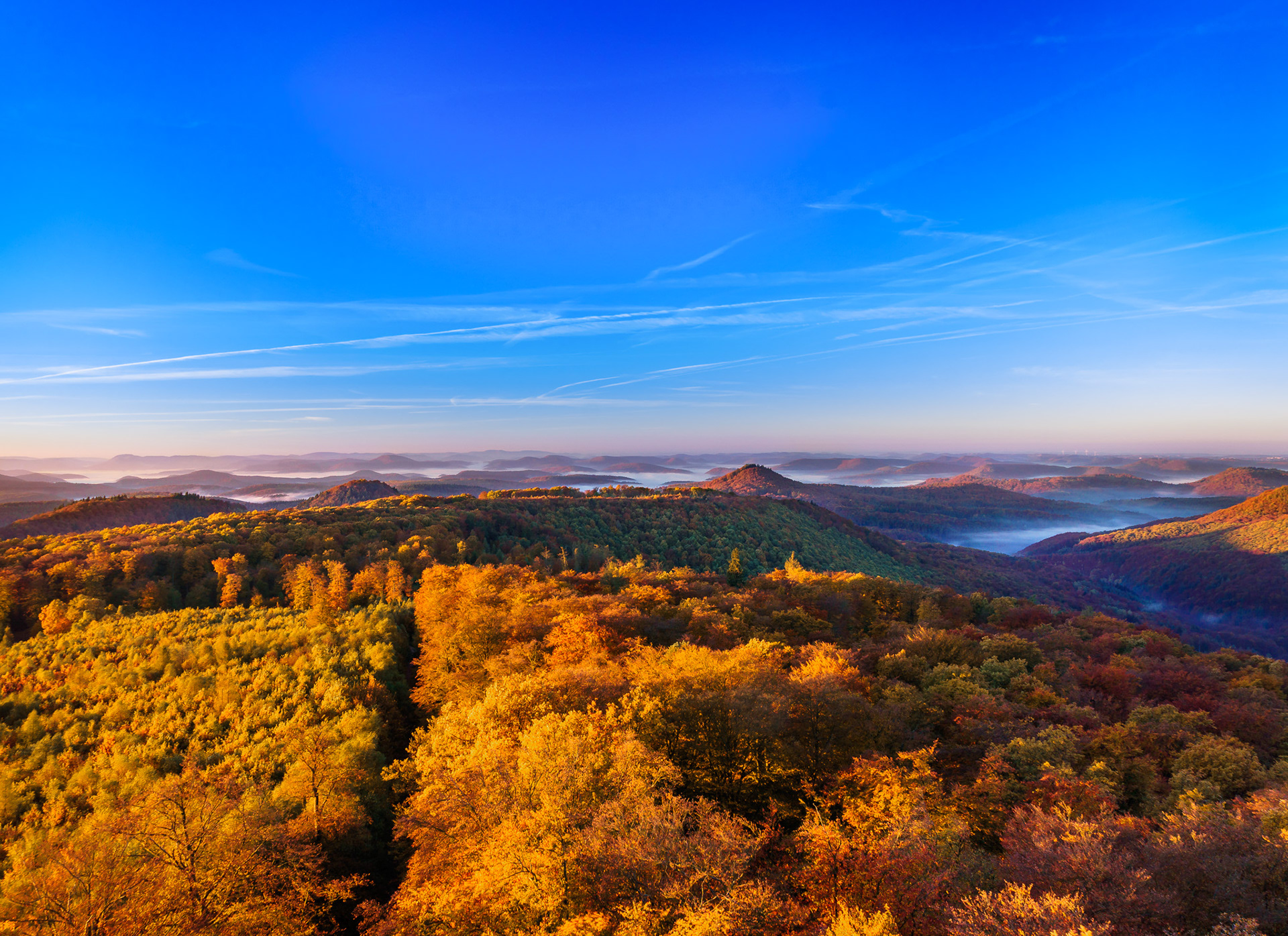 Sonnenaufgang über dem Pfälzerwald, fotografiert vom Luipoldturm bei Merzalben Blick nach Süden (Hermersbergerhof) / Blick nach Westen / Blick nach Nordwesten (Ruine Gräfenstein) / Blick nach Osten